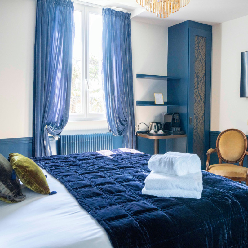L’esprit raffiné du Comptoir des Indes s’invite au cœur de votre Chambre Deluxe Madras, un élégant cocon de 18 à 20 m² situé au 2ᵉ étage de notre Villa à Ouistreham. Pensée pour accueillir 2 personnes, cette chambre mêle harmonieusement confort moderne, touches décoratives inspirées des Indes et atmosphère apaisante pour créer un cadre propice au repos et à la détente.
